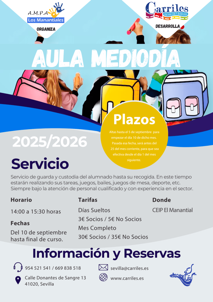 La empresa encargada del servicio es CARRILES Animación y Aventura es la misma entidad que gestiona actividades extraescolares, ludotecas, fiestas fin de curso, programas educativos y escuelas de verano en centros escolares de Sevilla y Cádiz.