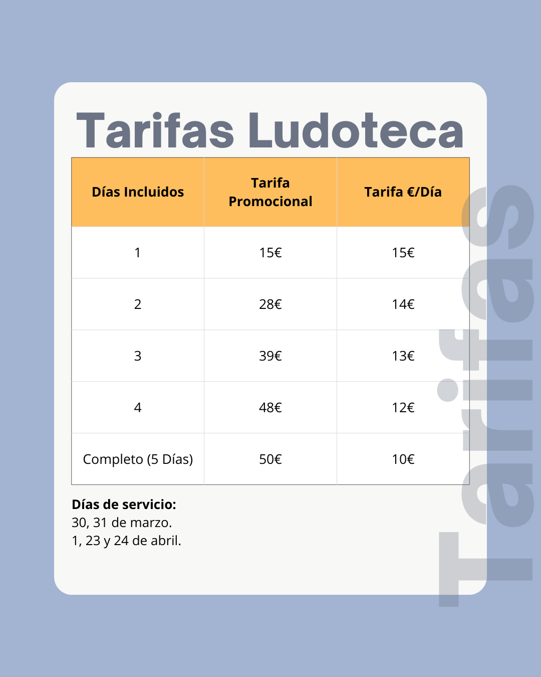 • Descuento de 5€ por contratar el servicio al menos de 3 días, aplicable al segundo hermano/a y sucesivos.