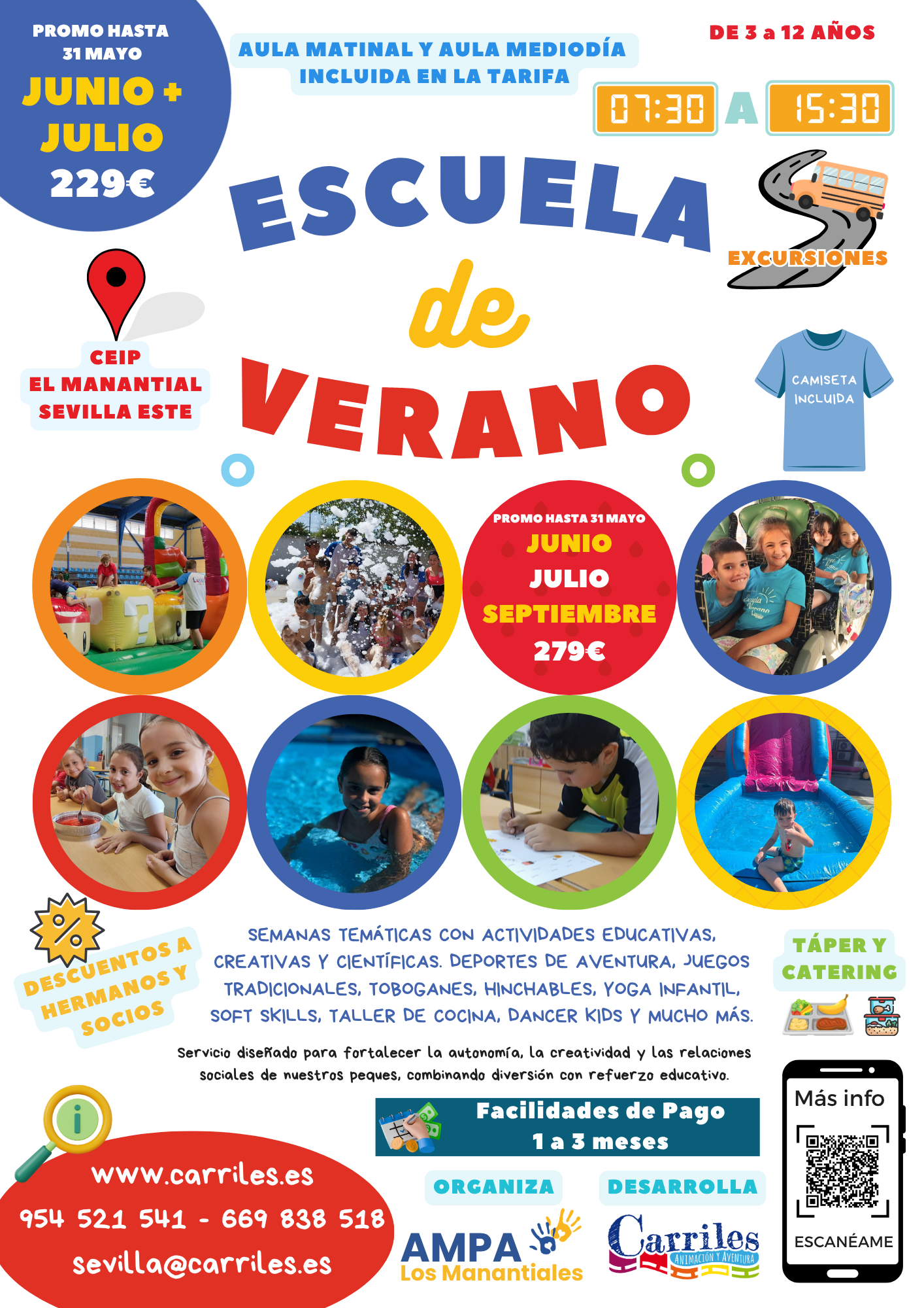 Nuestra Escuela de Verano ofrece a niños y niñas de 3 a 12 años una experiencia llena de diversión, aprendizaje y aventuras en un ambiente seguro. El horario es de 7:30 a 15:30, de lunes a viernes, con un programa adaptado a cada edad que incluye juegos deportivos, música, cocina, manualidades y actividades acuáticas. Los monitores profesionales acompañan a los niños para que aprendan, se diviertan y desarrollen nuevas habilidades.