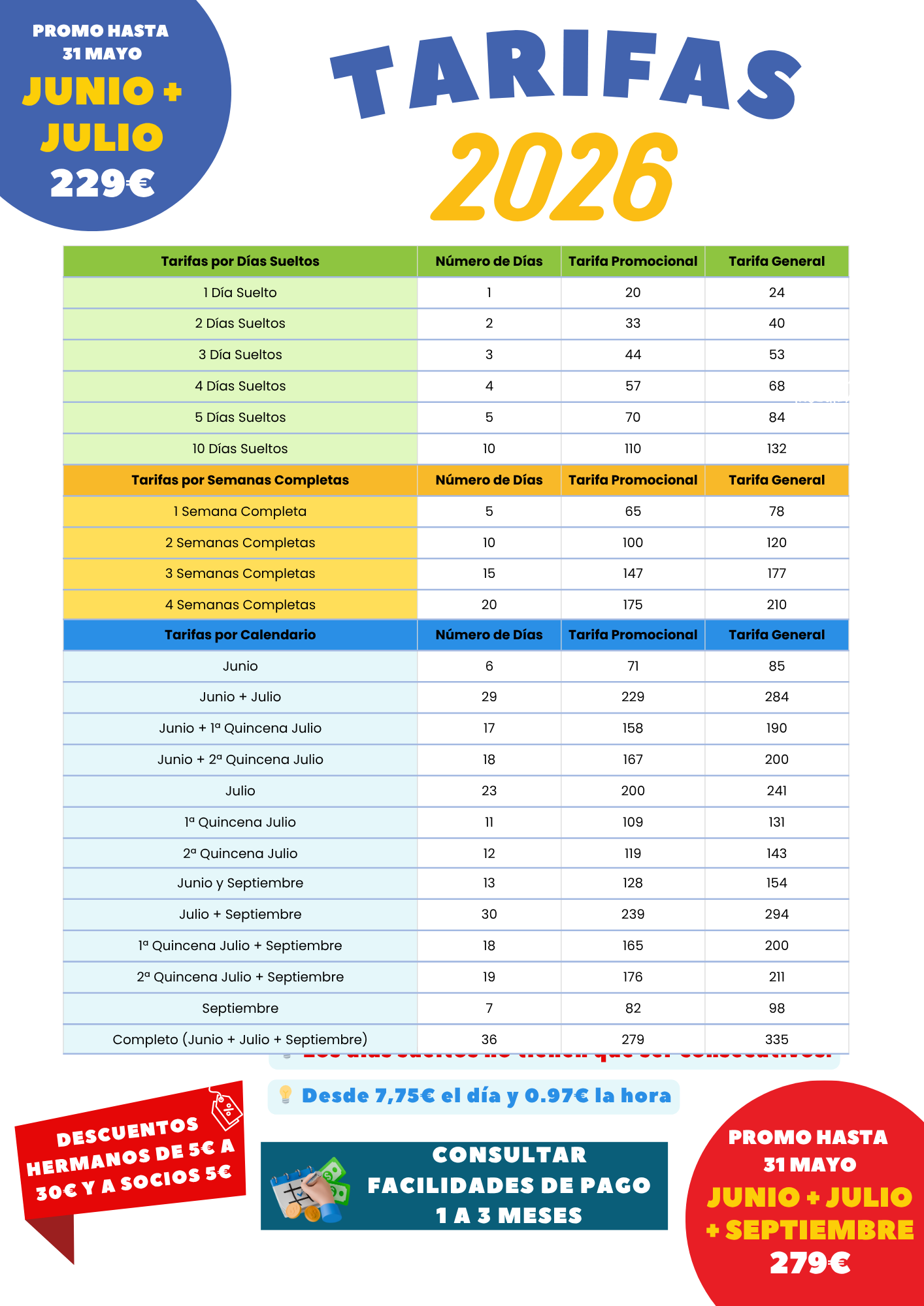 • Descuento de 5€ por contratar el servicio al menos de 5 días, aplicable al segundo hermano/a y sucesivos.