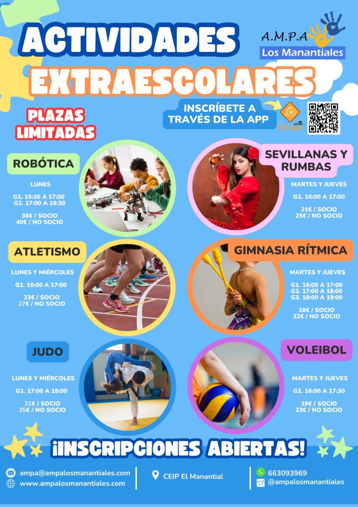 Desde esta sección, iremos informando de las actividades extraescolares que la A.M.P.A. Los Manantiales tenga pensado organizar. No confundir con las actividades extraescolares del Plan de Apertura del centro, las cuales se solicitan en la secretaría del centro.