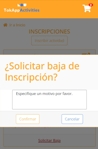 Accede a Inscripciones, selecciona la actividad para la que deseas solicitar la baja, indica el motivo y confirma tu petición.